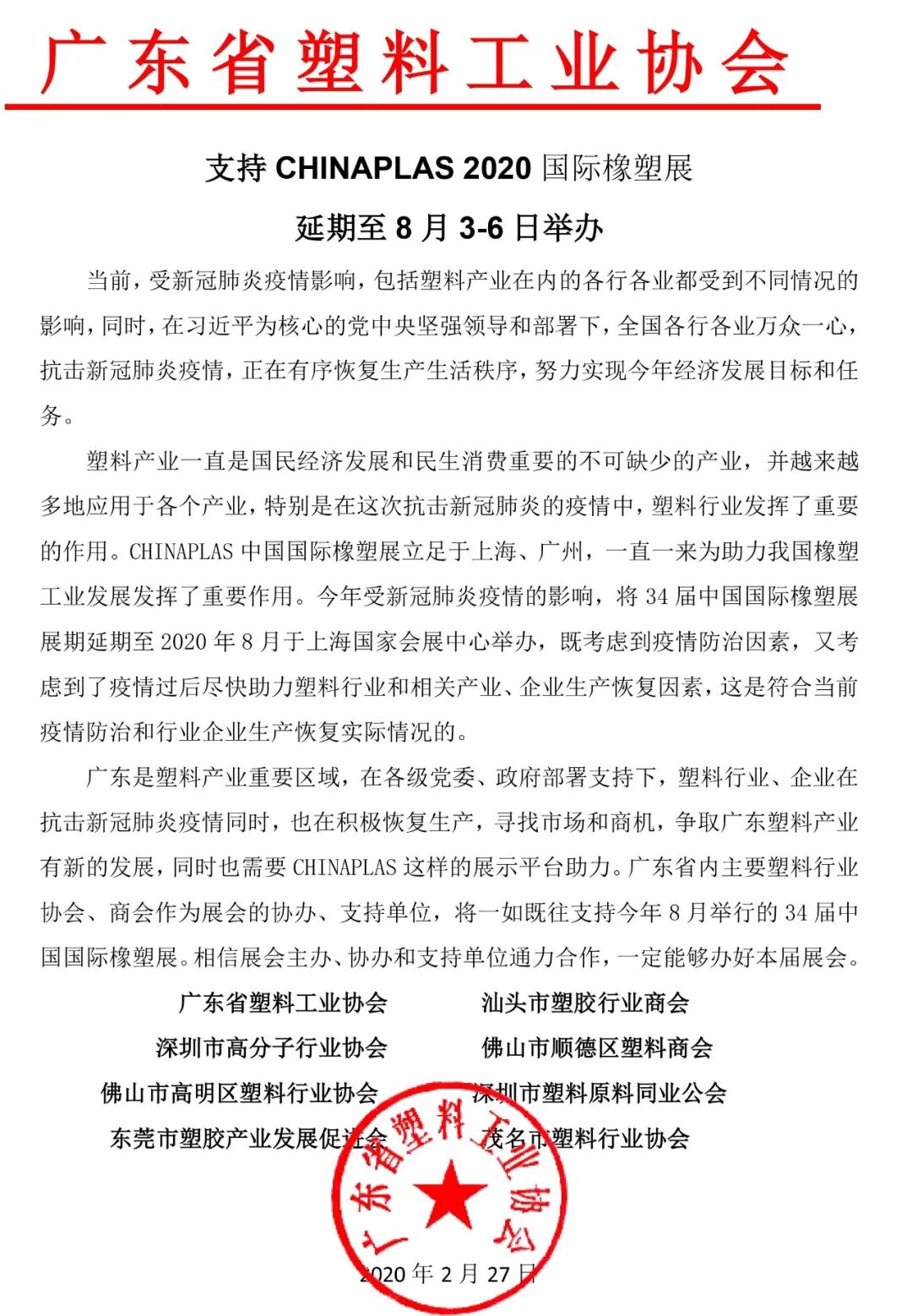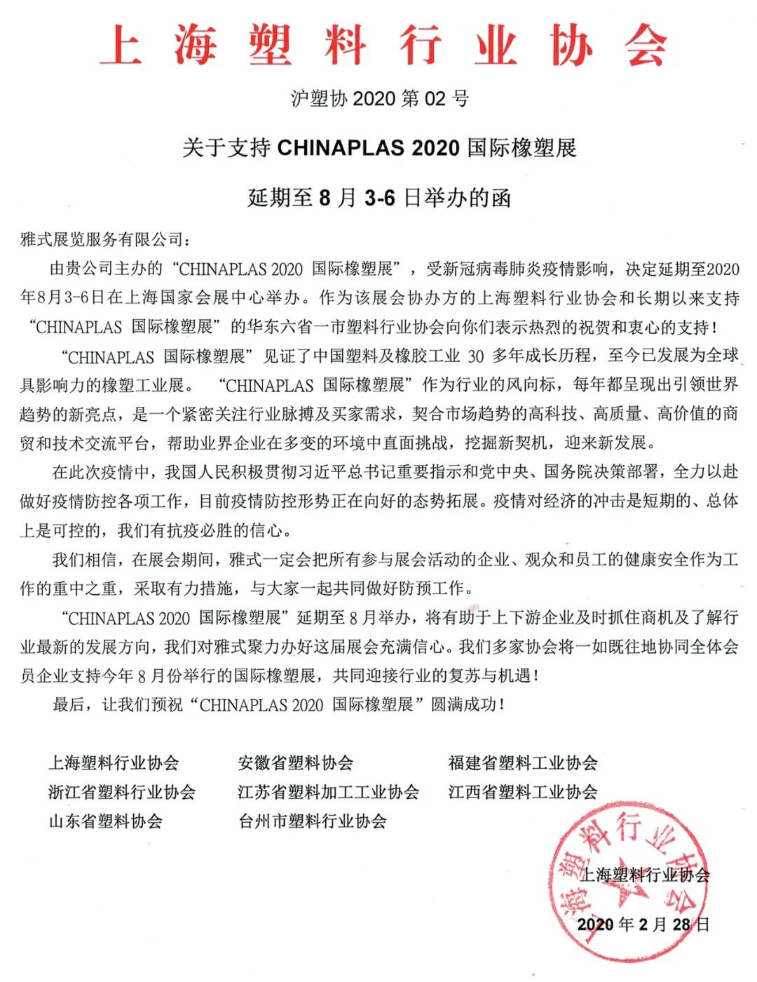 为进一步加强新冠病毒肺炎疫情的防控,确保广大参展商及观众的身体健康和生命安全,“CHINAPLAS 2020 国际橡塑展”延期到8月3 - 6日,在上海·虹桥·国家会展中心举行。