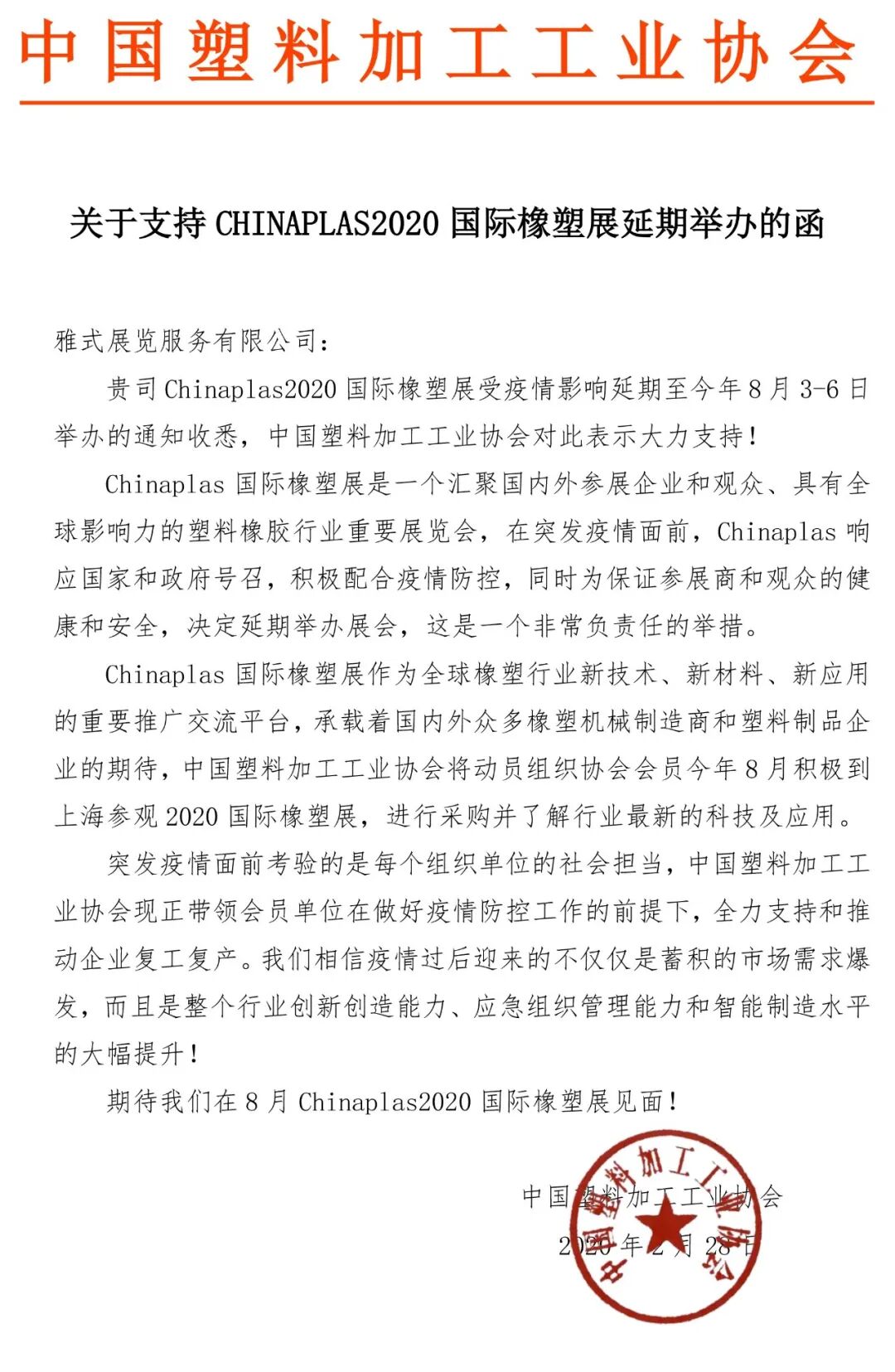CHINAPLAS 2020 国际橡塑展延期至8月举办,将有助于上下游企业及时抓住商机及了解行业最新的发展方向,我们对雅式聚力办好这届展会充满信心。